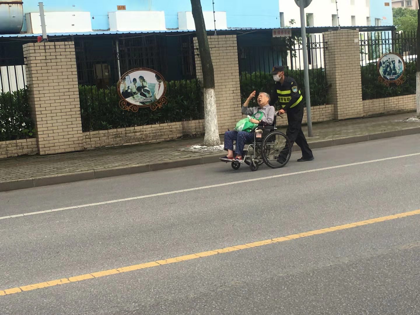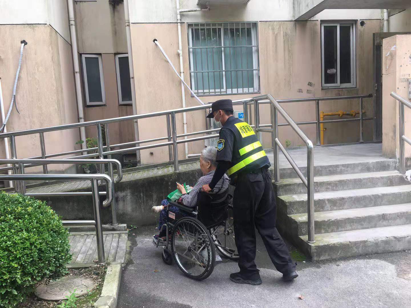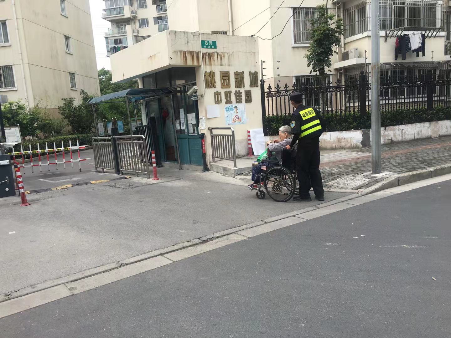 6月8日,宗保公司駐周浦市容項目隊員張柯旋,巡邏至瑞陽路331號時,發(fā)現(xiàn)一名坐著輪椅的老人橫在馬路中間。馬路上車來車往,沒有車輛主動避讓,老人的處境非常危險。
