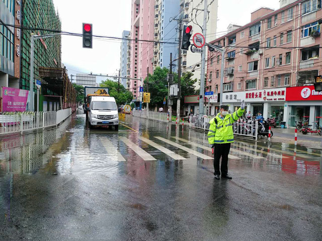 6月5日,閔行區(qū)虹梅南路莘朱路路口,由于突降暴雨,下水道堵塞路面積水,嚴(yán)重影響道路交通安全。