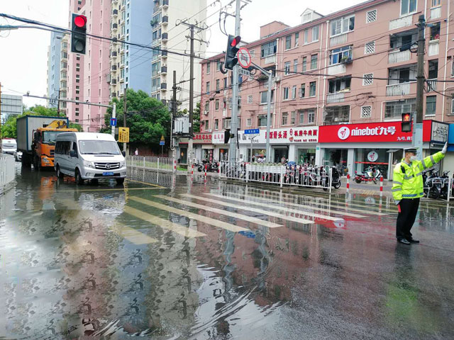 宗保公司駐莘莊梅隴交通輔警項(xiàng)目隊(duì)員李曉龍,暴雨中堅(jiān)守崗位,不顧雨水澆身,配合交警鎮(zhèn)定指揮,疏導(dǎo)交通排堵保暢,及時(shí)引導(dǎo)車(chē)輛避免駛?cè)敕e水路段,確保了道路交通安全。