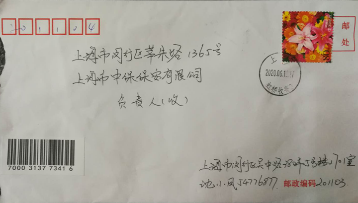 6月12日,宗保公司駐閔行莘莊梅隴交通輔警項目隊員雷志奎收到市民沈小鳳老人家屬寄來的一封感謝信。