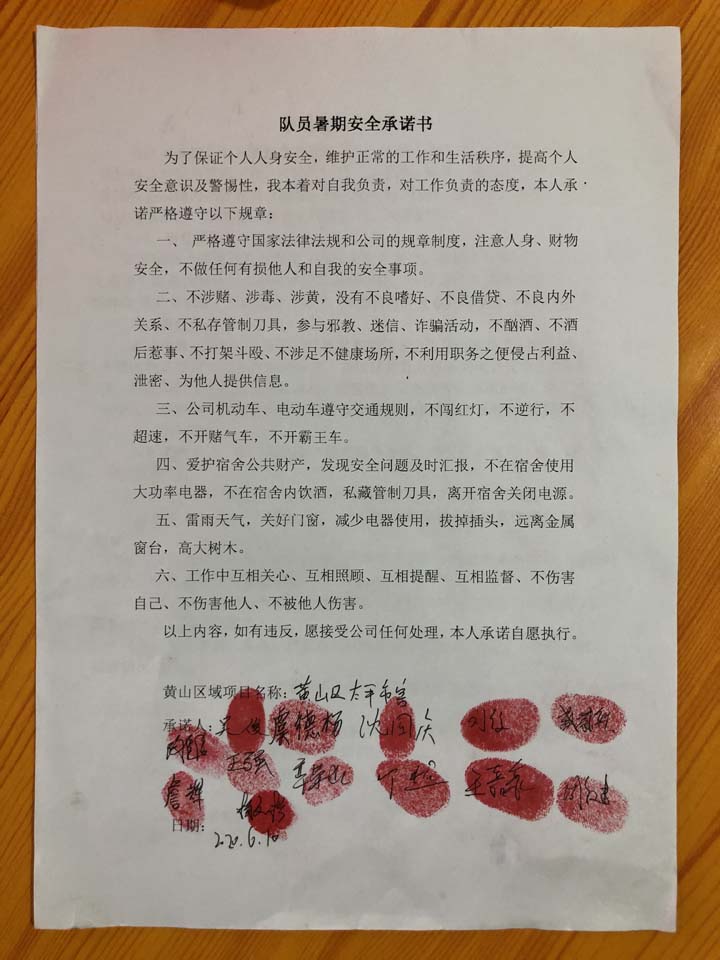 6月15日,南京華僑城項目經(jīng)理朱曉遠組織召開全體隊員安全工作會議,對暑期安全工作進行再動員再部署,分析講解各類安全事故案例,學(xué)習(xí)公司暑期安全工作實施方案,與所有員工簽訂暑期安全工作責(zé)任書,并帶領(lǐng)項目全體骨干逐個排查宿舍安全隱患,銷毀違禁品,通過召開隊伍會的形式進行教育引導(dǎo)。
