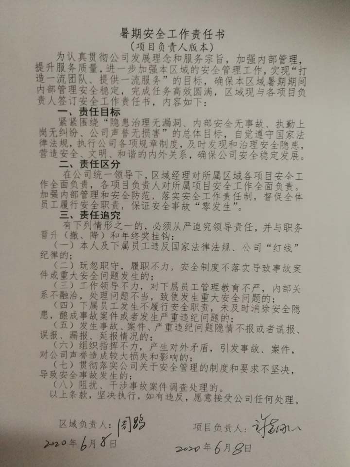 6月15日,閔行區(qū)域經(jīng)理周鹍組織召開本區(qū)域骨干安全工作會議,結(jié)合閔行區(qū)域的實際情況,制定安全工作實施方案,參照公司下發(fā)的“十查十防”一覽表進行自查自糾,逐項梳理、查漏補缺。對本項目自身難以解決的安全隱患,及時上報區(qū)域經(jīng)理,并與每位隊員簽訂安全防范責(zé)任書,切實提高所有隊員的安全防范意識。