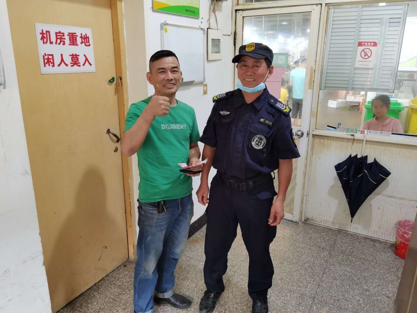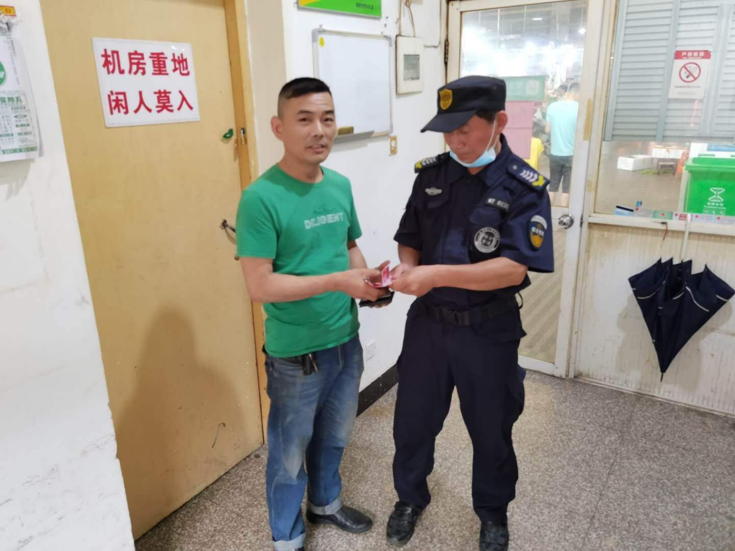 6月25日15:00,該項(xiàng)目隊(duì)員沈東林在星橋農(nóng)貿(mào)菜場(chǎng)巡邏時(shí),撿到500元現(xiàn)金,詢問周邊商戶和行人無果后,小沈就將情況上報(bào)給當(dāng)班負(fù)責(zé)人付串串。付串串立即查看監(jiān)控,發(fā)現(xiàn)是一名中年男子掉的錢。