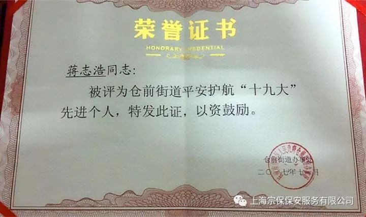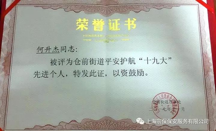 杭州倉前輔警項(xiàng)目隊(duì)員蔣志浩、張小龍、何升杰三人在此次“平安護(hù)航十九大”安?;顒?dòng)中被倉前街道評(píng)為“先進(jìn)個(gè)人”,獲得榮譽(yù)證書及物質(zhì)獎(jiǎng)勵(lì)。