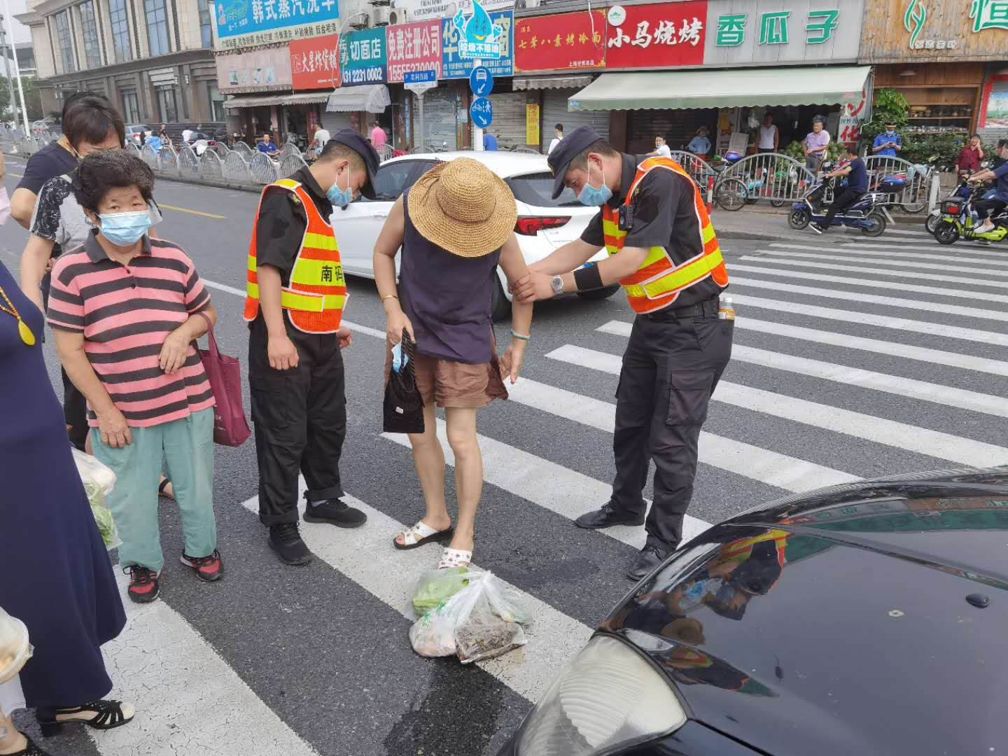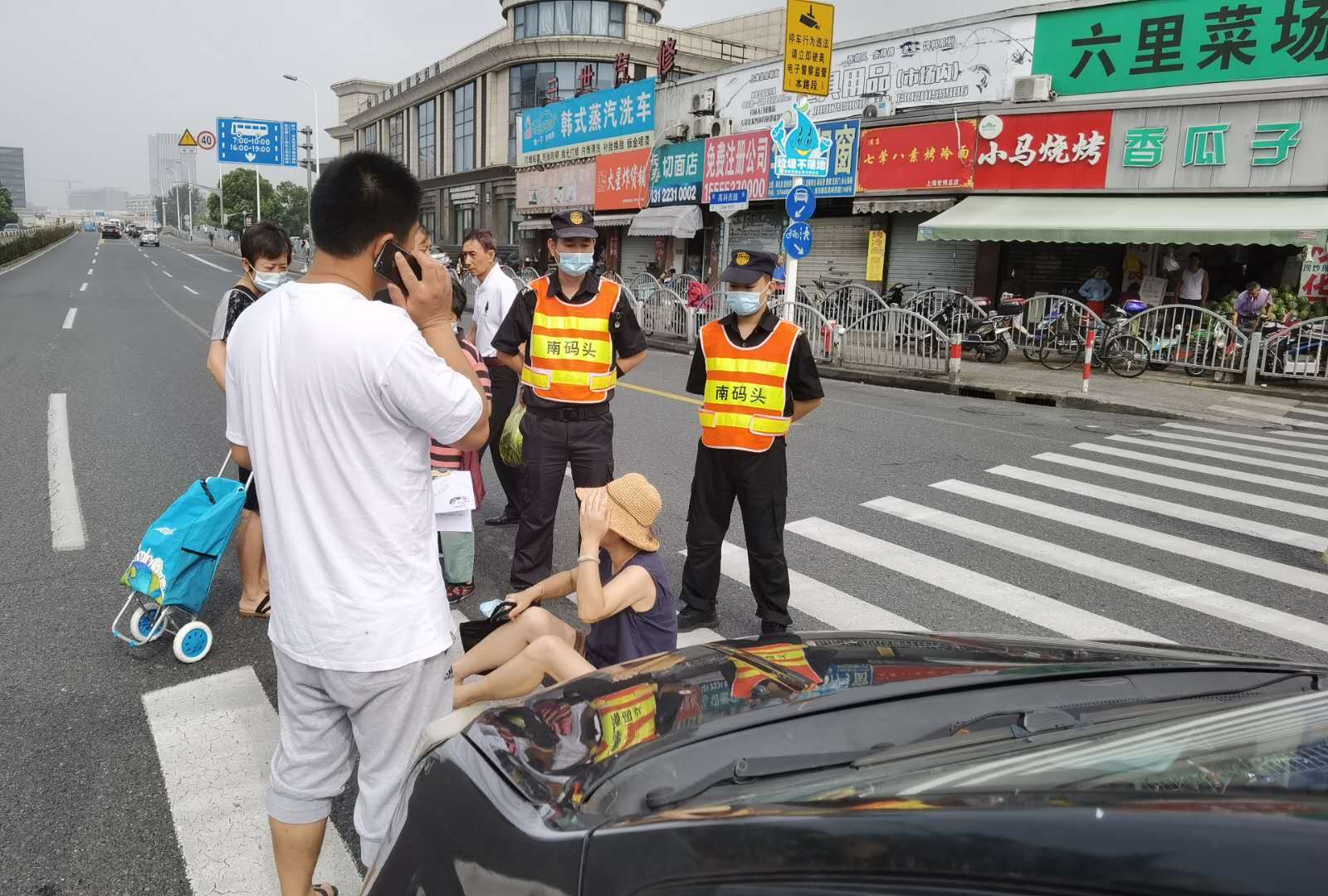 7月21日10點(diǎn)左右,南碼頭市容項(xiàng)目隊(duì)員劉輝、方可杰在高科西路蒲三路交叉口執(zhí)勤時(shí),路口突發(fā)一起交通事故,一名行人被轎車撞傷。兩名隊(duì)員立即上前詢問傷者情況,幫助傷者聯(lián)系家人。