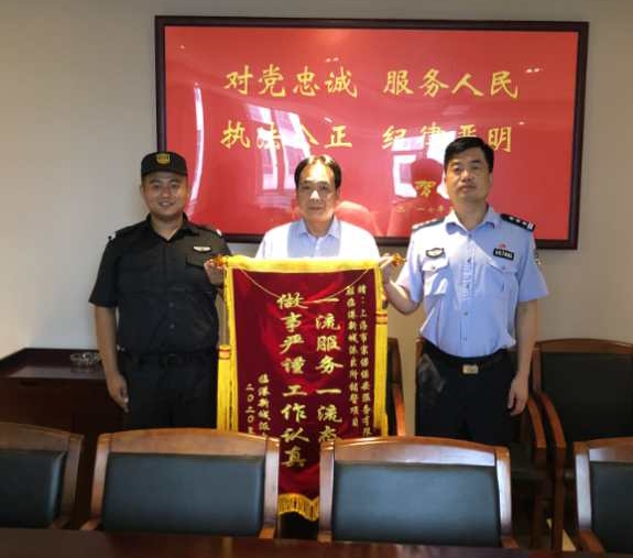 7月31日,臨港新城派出所副所長(zhǎng)施軍杰將一面繡有“一流服務(wù),一流態(tài)度,做事嚴(yán)謹(jǐn),工作認(rèn)真”的錦旗送到宗保公司臨港區(qū)域項(xiàng)目經(jīng)理王書(shū)劍和隊(duì)長(zhǎng)張龍手中,并合影留念。