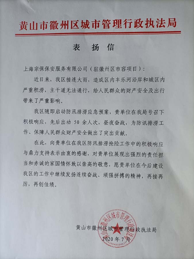 8月4日,宗保公司收到一封來(lái)自黃山市徽州區(qū)城市管理行政執(zhí)法局的表?yè)P(yáng)信,信中對(duì)在防汛期間,為防汛排澇工作提供有力支撐的公司駐黃山市徽州市容項(xiàng)目提出表?yè)P(yáng)。