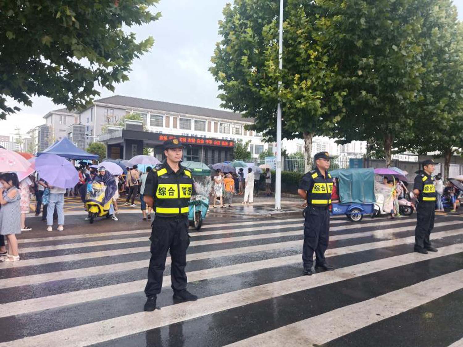 根據(jù)甲方要求,結(jié)合當(dāng)?shù)靥鞖馇闆r,綜合臺風(fēng)等突發(fā)因素的影響,公司選派人員參與早晚高峰的護(hù)校工作,做好學(xué)校周邊區(qū)域的治安和交通狀況巡查,加強(qiáng)上學(xué)和放學(xué)時(shí)間段的管理,全力維護(hù)學(xué)校正常教學(xué)和生活秩序。