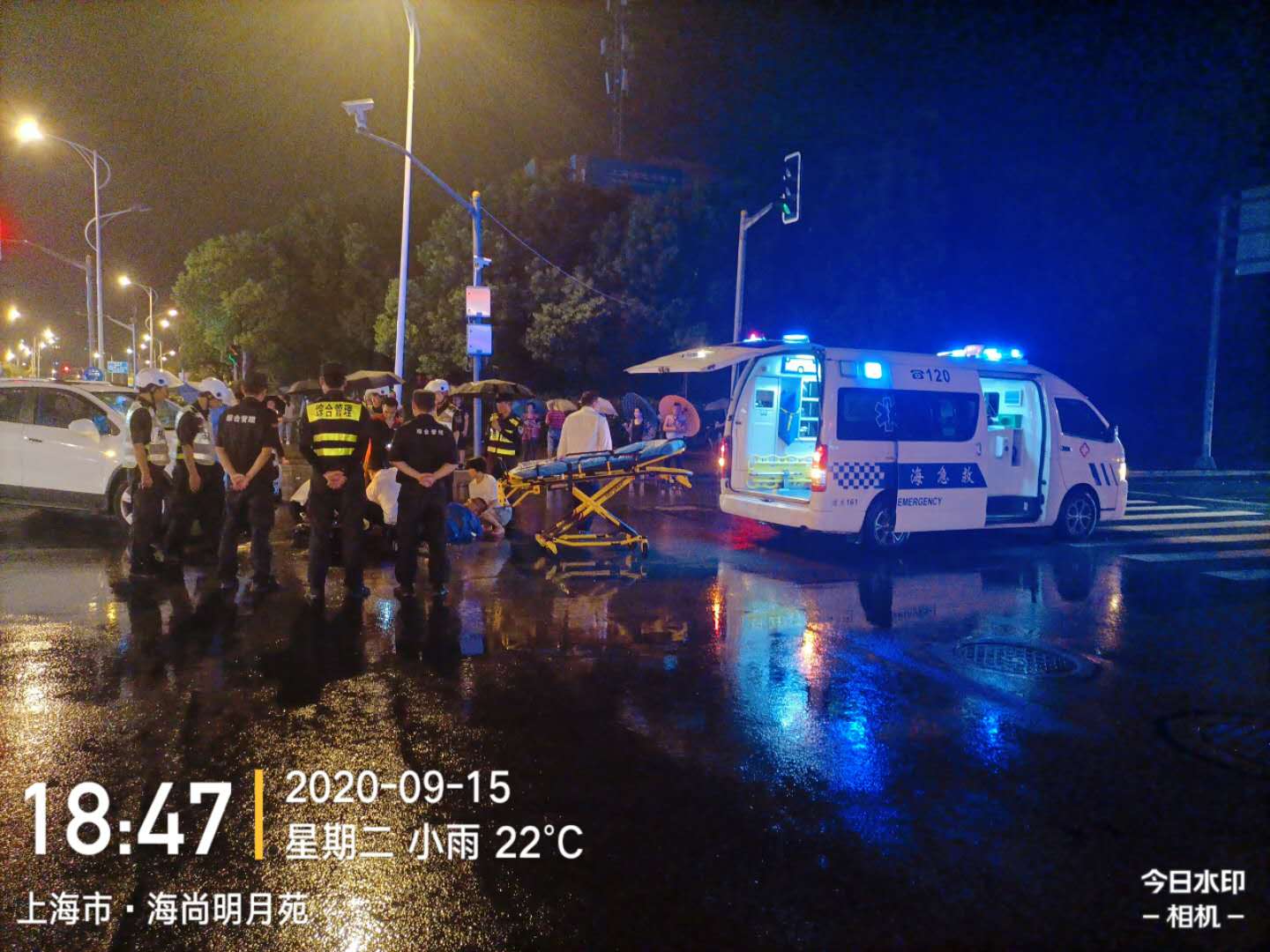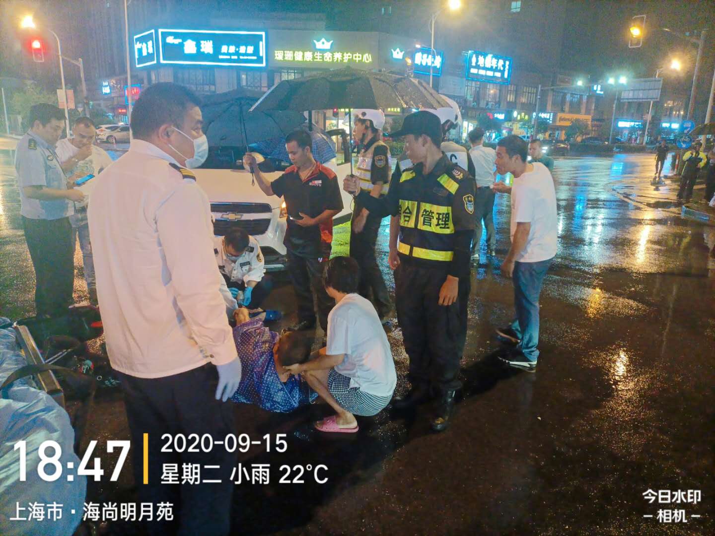 9月15日18:50,細(xì)雨綿綿,蘆潮港市容隊(duì)員侯亞林、劉勇輝冒雨巡邏至港輝路與蘆云路交叉口時(shí),路口處剛發(fā)生一起交通事故,有人員受傷,現(xiàn)場(chǎng)圍觀(guān)群眾較多。