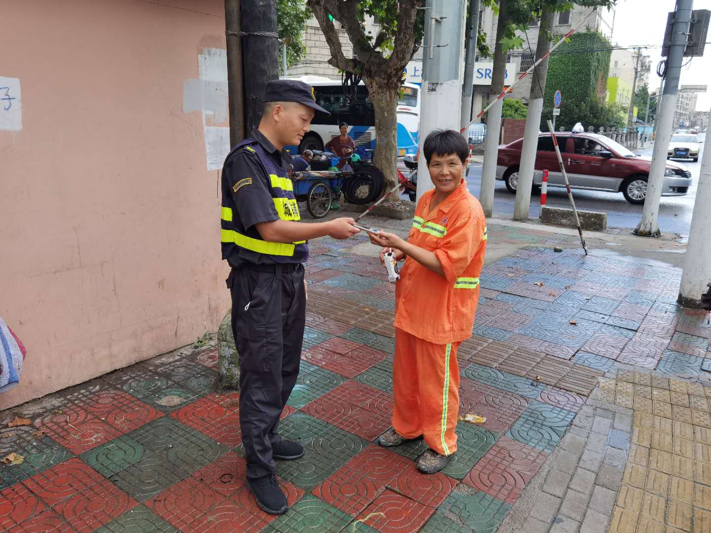 8月28日,周浦市容隊員尹釗在德浦路康沈路路口巡邏時,在路邊撿到一部手機,后尋找到失主將其歸還。