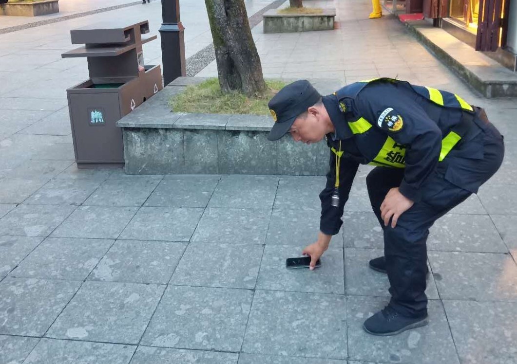 當(dāng)日,歙縣項(xiàng)目隊(duì)員吳超在古城景區(qū)巡邏時(shí)發(fā)現(xiàn)一部遺落在地面的手機(jī),撿起后發(fā)現(xiàn)手機(jī)設(shè)置屏鎖,無(wú)法聯(lián)系失主,便立刻向項(xiàng)目負(fù)責(zé)人報(bào)告,并在原地等待。