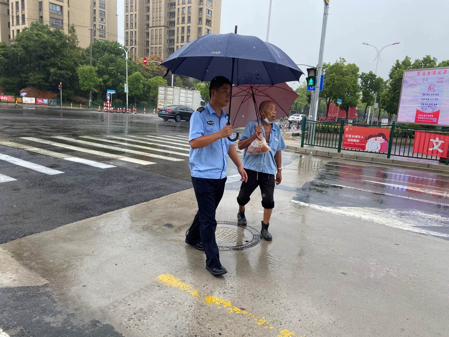 當(dāng)日11:00,厲國在崗位巡查時,發(fā)現(xiàn)一位老大爺在崗?fù)じ浇腔?,神情焦慮,便即刻上前詢問。老大爺年事已高,記不起家人的聯(lián)系電話,身上又沒有帶通訊工具,下雨了急著回家,卻找不到回家的路了。