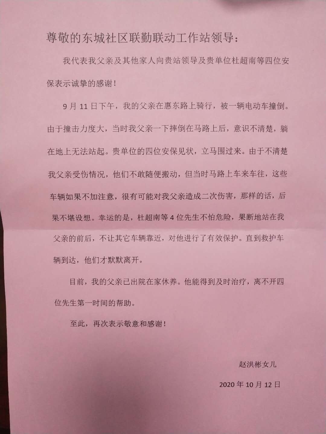 事后,老人家屬通過監(jiān)控了解到是宗保隊員全力救助了老人, 非常的感動,特意定制了錦旗,還送來了感謝信。