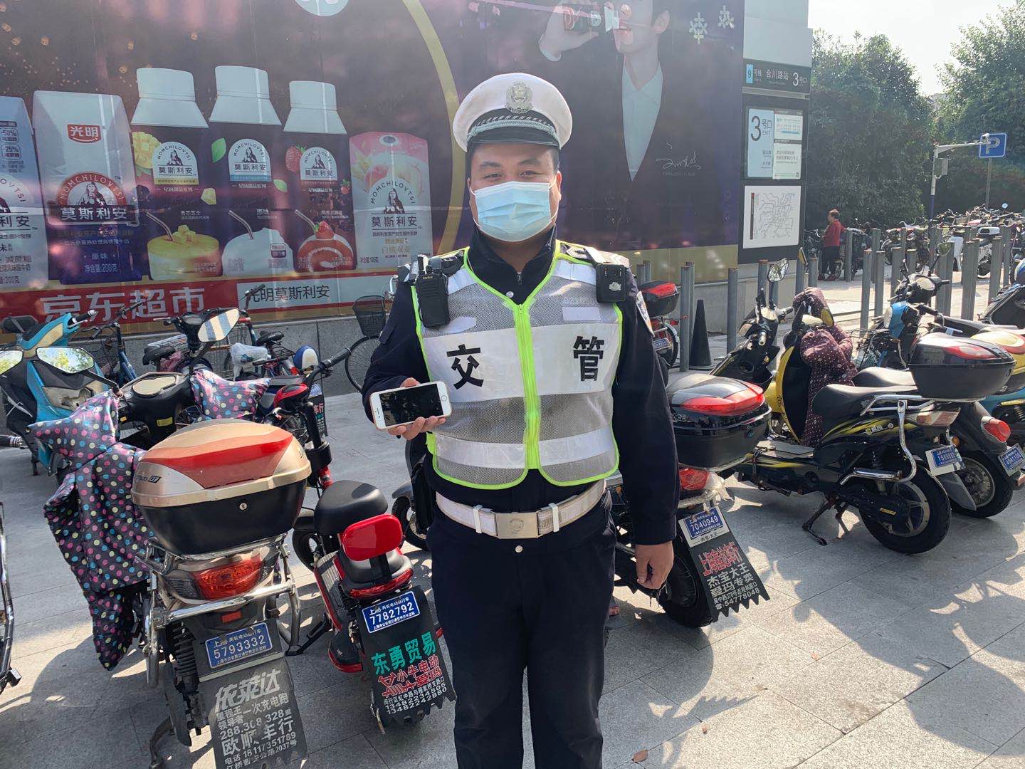 當(dāng)天16:30左右,付志勇在莘松西環(huán)路口值勤時(shí),撿到一部手機(jī),因手機(jī)設(shè)有開機(jī)密碼,無法獲取失主的聯(lián)系電話,便在路口邊維持交通秩序,邊等待失主主動(dòng)聯(lián)系。