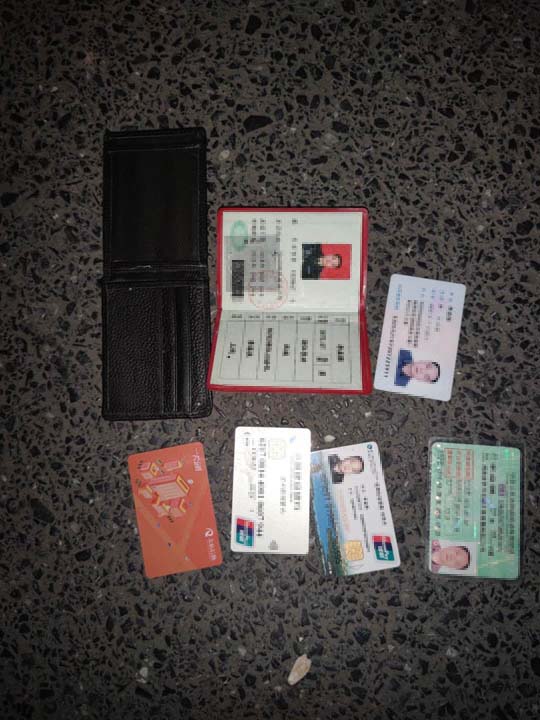 當(dāng)天18:30左右,楊有福巡邏至何母橋村委時(shí),在非機(jī)動(dòng)車道地上撿到一個(gè)錢包。為尋找失主信息,楊有福打開錢包清點(diǎn),內(nèi)有身份證、駕駛證、市民卡、銀行卡和軍官證等物品??紤]到失主丟失證件一定很著急,便在原地等待。