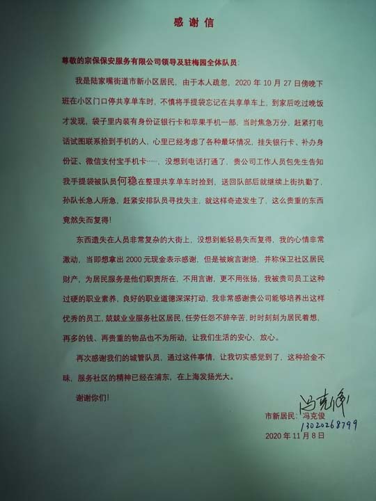 10月30日,宗保公司駐周浦市容項(xiàng)目隊(duì)員楊珂賀撿到錢包歸還失主,獲得好評(píng)。