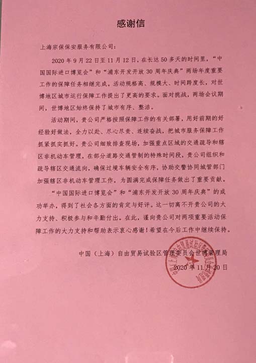 12月8日,自由貿(mào)易試驗(yàn)區(qū)管理委員會(huì)世博管理局將一面繡有“精神飽滿 精益求精”的錦旗和一封感謝信送到宗保公司副總經(jīng)理王耀的手中,對(duì)公司在“中國國際進(jìn)口博覽會(huì)”和“浦東開發(fā)開放30周年慶典”活動(dòng)提供的有力保障和幫助表達(dá)誠摯的感謝。
